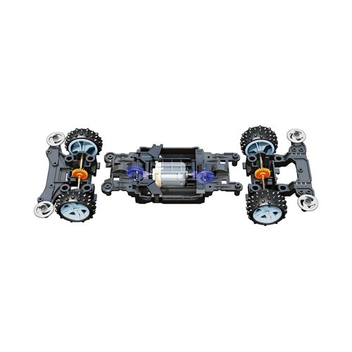 優れた剛性を実現する3分割式「MSシャーシ」はモーターやバッテリーといった重いパーツをシャーシ中央に配置した「ミドシップ(MS)レイアウト」とミニ四駆伝統の4WD(四輪駆動)機構で、高速走行時にも優れた安定性を発揮します。