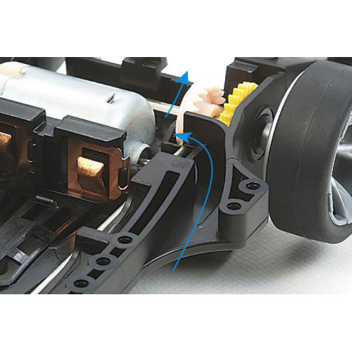 空力の追求はもちろん、整備性や剛性、拡張性など、現代のミニ四駆レースに必要な要素をすべて兼ね備えたのがARシャーシ。アンダーパネルをはじめディフューザーはワンタッチで取り外しでき、カウンターギヤを除く全てのギヤがシャーシ底面側からアクセス可能。ボディを装着したままモーター交換やグリスアップが行え、電池交換もスピーディー。