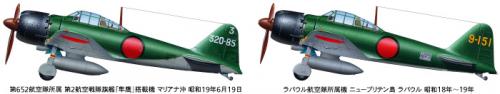 太平洋戦争の全期間を通して日本海軍の主力戦闘機として飛び続けた零戦。中でも大戦後半、高速重武装のアメリカ軍戦闘機に対抗するため二二型に続いて登場したのが五二型です。エンジンは二二型と同じ1130馬力の「栄」二一型でしたが、排気管を従来の集合式から推力式単排気管に変更、翼幅を11mに短くし、端部を半円形に整形するなど各部に改良が加えられ、最高速度は565km/hへと向上。固定武装として機首に7.7mm機銃2挺、両翼に長銃身化された 20mm機銃2挺を搭載していました。五二型は昭和18年秋に部隊配備が開始され、ソロモン諸島の戦いやマリアナ沖海戦、そして日本本土防空戦など大戦後半のほとんどの戦いに出撃、質・量ともに圧倒的に優勢なアメリカ軍を相手に終戦の日まで奮戦を続けたのです。