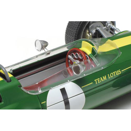 【 F1初のモノコック構造を採用した革新マシン 】 それまでの鋼管スペースフレームに変えて、アルミ板を箱型に成形した軽量・高剛性なモノコックシャーシをF1マシンとして初採用。その後のマシンに大きな影響を及ぼすとともに、チーム・ロータスの先進性を確立したのがロータス25です。注目のモノコックは、D字型断面のチューブ(中空構造)を左右に配置し、床板や前後の隔壁を組み合わせ、全体としてU字型のフレームを構成するツインチューブ式。低く、細く設計されたこのモノコックは、ドライバーがちょうど浴槽につかっているような姿勢になるためバスタブタイプとも呼ばれました。エンジンはコベントリー クライマックス製の1.5リッターV型8気筒。J.クラークのドライビングによりデビューシーズンとなった1962年に3勝をあげ、さらに翌63年は10戦中7勝と圧倒的な強さを見せ、チャンピオンマシンとなったのです。