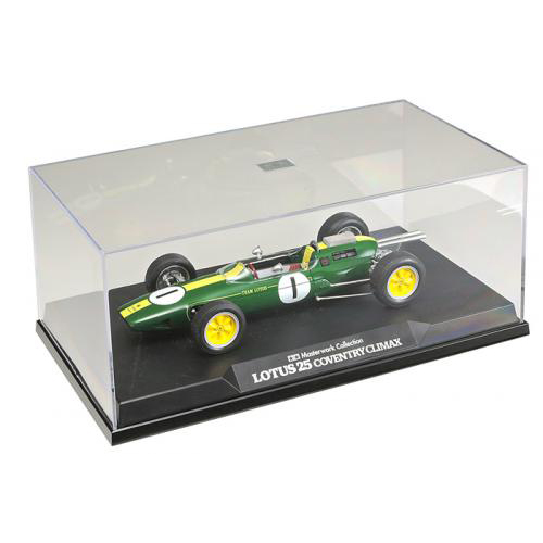 【 模型要目 】 ★F1マシンに革新をもたらしたロータス25。1963年の第5戦イギリスGP優勝車を再現したプラスチックモデル完成品です。★モデル全長193mm、全幅81mm。★モノコック構造を採用した葉巻型のスリムなボディを美しいブリティッシュグリーンで塗装。★前後とも足まわりにはブレーキホースを表現して精密感を高めています。★スクリーン固定用リベットはインレットマーク、サイドミラー面にはメタリックステカーを使用して質感も充分。★エンジン本体にはプラグコードを追加するなど完成品ならではのディテールも見所です。★ネームプレート付き台座とクリヤーケース付き。ウインドウパッケージを採用してそのままディスプレイが楽しめます。
