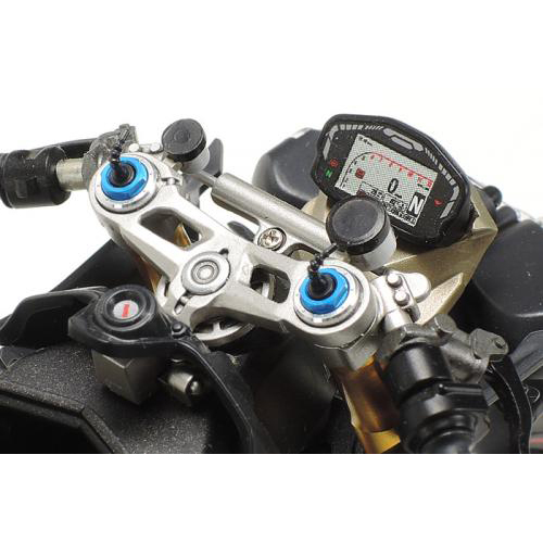 【 仕上がりの精密感をさらに高めるディテールアップパーツ 】 1/12スケールのドゥカティ 1199 パニガーレSにいっそうの見ごたえをプラスして完成度を高めるディテールアップパーツセットです。ゴールドアルマイト仕上げのアウターチューブやリザーバータンク、ブルーアルマイトのフォークトップ、ブラックアルマイトのアウターチューブエンド、さらにブレーキディスクのフローティングピンもアルミ製。また、独特の質感をもつインナーチューブはゴールドメッキの真ちゅう製を採用。金属ならではの輝きとシャープな表現が魅力です。また、フォークボトムと電子制御用ワイヤ基部はプラスチックパーツで用意しました。