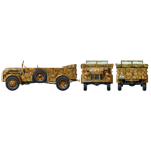 第二次大戦初期の1941年に生産が開始されたドイツの大型軍用乗用車がシュタイヤー1500A/01です。軍用車輌の車種や規格を統一して生産性を高めるシェル計画に基づいて開発。定員8名の車体に空冷8気筒85馬力のガソリンエンジンを搭載し、全輪駆動の優れた足まわりによって舗装路上では最高 100km/hでの走行が可能でした。西部戦線からロシア、北アフリカなどあらゆる戦線で幅広い任務に使用され、1944年までに各種合わせて 12,450台が生産されました。
