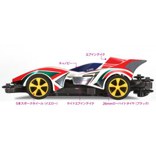 空力の追求はもちろん、整備性や剛性、拡張性などミニ四駆レースに必要な要素をかねそなえているのがARシャーシ。ボディ各部から取り込んだ走行風をスムーズに流して、シャーシ内部の電池やモーターを冷やし、熱によるパワーダウンを防止。ボディとシャーシのエアインテークをリンクさせて、高い冷却効果を生み出します。また、低摩擦樹脂製のプラベアリングを装備して、駆動ロスを少なくするとともに軽量化を実現しているのもポイントです。アンダーパネルとディフューザーはボディを外すことなく簡単に取り外し可能。さらに、リヤスキッドバーを標準装備。スロープセクションなどの坂道コースを通過する時に、低摩擦樹脂製のスキッドバーがコース路面と接触。マシンの姿勢を制御してコースアウトを防止します。イエローカラーの5本スポークホイールにローハイトタイヤを装着。3.5:1の超速ギヤ付き。