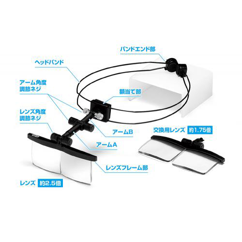 レンズはふち無しの非球面タイプでクリアな視界を確保。拡大率の異なる2種(約1.75倍/約2.5倍)が付属し、作業内容にあわせて交換する事ができます。