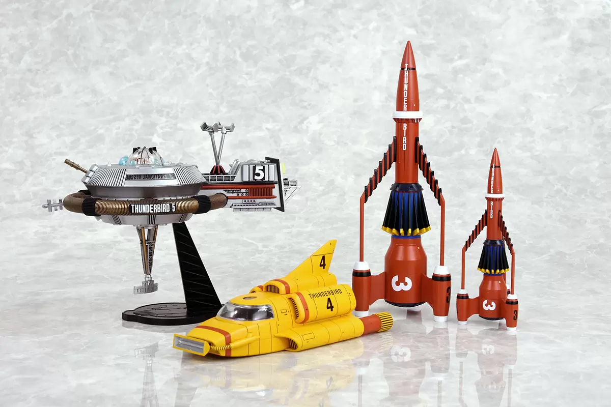 第三弾の本商品は、宇宙空間での救助活動を行う宇宙ロケット「サンダーバード3号」、 水中救助活動専用の小型潜水艇「サンダーバード4号」、 世界中からのSOSを受信する宇宙ステーション「サンダーバード5号」の3機セット。