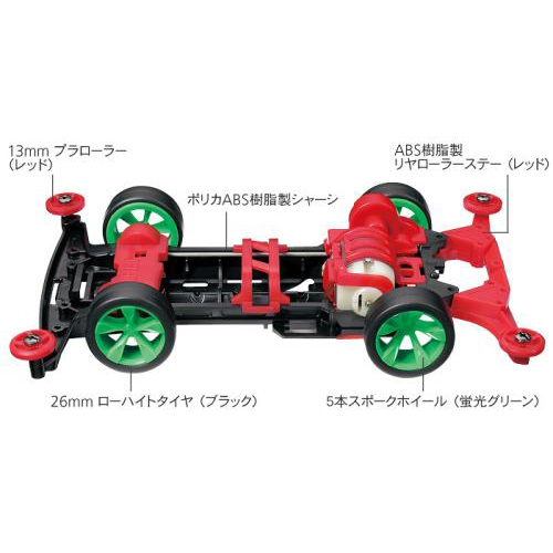 【 進化をとげた星馬豪のマグナムセイバー 】 高性能な走りでレースも楽しい四輪駆動レーサーのプラスチックモデル組み立てキットです。ミニ四駆マンガ「爆走兄弟レッツ&ゴー!!」の主人公、星馬豪のマシン、マグナムセイバーを原作コミックのデザインイメージで仕上げました。ボディはピュアーホワイト、ステッカーはコミックに合わせたデザインを採用。シャーシは剛性・拡張性が高いスーパーII。蛍光グリーンの5本スポークホイールに、ローハイトタイヤを装着し、前後に13mm樹脂ローラーも装備しました。ギヤ比は3.5:1の超速タイプをセット。組み立ては接着剤を使わないはめ込み式、豊富なパーツで性能アップも楽しめます。