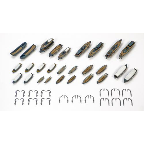 日本海軍の各種艦載艇は、艦船に搭載され兵員輸送、物資運搬などに広く活躍しました。この日本海軍艦船に欠かせない名脇役、各種艦載艇を1/350スケールで再現しました。内火艇や通船など11種28隻をモデル化。エッチング製の架台と、架台の取り付け位置を示すガイドステッカーも用意。