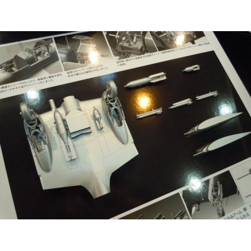 ★全長243mm。★100kg爆弾と250kg爆弾、RS-132ロケット弾をセット。ロケットランチャーは3種類を用意。★乗員の人形2体とマーキング3種類付き。★風防塗装用のマスクシールもセット。
