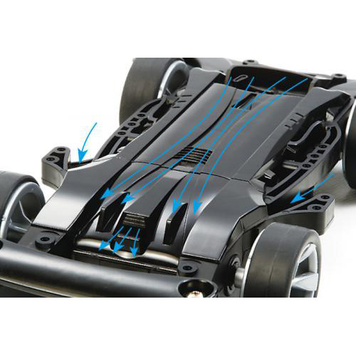 シャーシ下面後部は跳ね上げられたディフューザー形状。空気をスムーズに流すアンダーパネルの形とあいまって、空気の流れを加速させて負圧を生み出すベンチュリー効果を発揮。路面に吸い付くように走る姿は実車のレーシングマシンそのままです。