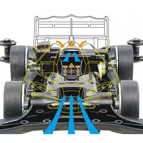 コクピットサイドのインテークはもちろん、シャーシ側面にもモーター冷却用のエアダクトを配置。2ヶ所から取り込んだ走行風をダイレクトにモーターにあてて効率的に冷却。トルクを低下させる熱ダレを防ぎます。