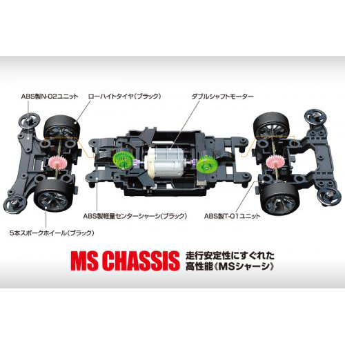 【 MSシャーシ 】 優れた剛性を実現する3分割式「MSシャーシ」はモーター両端のシャフトを伸ばしたダブルシャフトモーターやバッテリーといった重いパーツをシャーシ中央に配置した「ミドシップ(MS)レイアウト」とミニ四駆伝統の4WD(四輪駆動)機構で、高速走行時にも優れた安定性を発揮します。シャーシはノーズ、センター、テールの3パートで構成され、ワンタッチで脱着OK。スピーディーで幅広いセッティング変更が楽しめます。