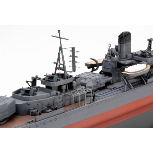 太平洋戦争中の主要な作戦に参加しながらほぼ無傷で終戦を迎え、「奇跡の駆逐艦」と呼ばれた雪風。戦艦大和の護衛に就いた昭和20年4月の天一号作戦時の雪風の姿を再現したプラスチックモデル組み立てキットです。左右分割式の船体はフルハルとウォーターラインの状態が選択可能。増強された対空機銃やレーダーなど力強い姿を余すことなくモデル化しました。特に、各部の機銃はレーザー加工技術を駆使して消炎器や放熱板まで細密な仕上がり。主砲塔2基と魚雷発射管2基はポリキャップにより完成後も旋回できます。さらに、アンカーチェーンとプロペラシャフトは質感の高い金属製。後部マストのレーダーや対空機銃の防盾、ラッタルやプロペラガードなどはエッチングパーツでシャープな仕上がりです。フルハル状態のモデルを展示できる台座が付き、完成後はキットのパッケージに収納できます。