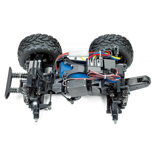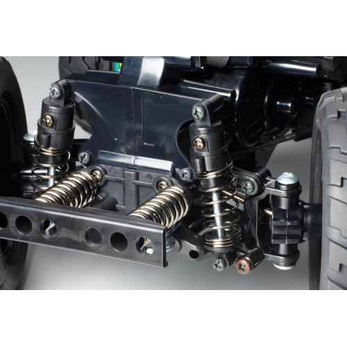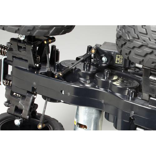 【 スクエア構成にビッグタイヤを装備した四輪駆動GF-01シャーシ採用 】 軽く強度も充分なモノコックフレームの中央にモーターを搭載して、ギヤで前後輪にパワーを伝達するギヤドライブ4WDを採用したのがGF-01シャーシ。ホイールベースとトレッドの比がほぼ等しい「スクエア」な構成も特徴です。フレーム一体型のギヤケースは、砂や小石をシャットアウトする密閉式。デフギヤを内蔵してスムーズなコーナリングを生み出します。サスペンションはフリクションダンパーを装備したダブルウィッシュボーン4輪独立。ステアリングサーボをシャーシ左側面にセットして、等長2分割タイロッドによりクセのない操縦特性を発揮します。また、ブラックカラーの5本スポークホイールに直径110mmの大径タイヤを装着し、車体後部には転倒を防ぐローラー付のサポートバーも装備しました。