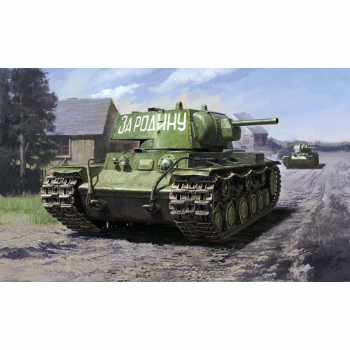 第二次大戦の開戦以来、華々しい勝利を重ねてきたドイツ戦車部隊が1941年夏のソビエト侵攻で遭遇した思いがけない強敵がKV-1です。最大75mmという強固な装甲に覆われ、当時のドイツ主力戦車であったIII号戦車、IV号戦車の砲弾をことごとく跳ね返したのです。あらゆるものを踏みつぶして突進してくる巨大な姿を、ドイツ軍将兵は恐れを込めて「怪物」と名付けました。なお、角張った溶接砲塔に強力な39口径76.2mm戦車砲F-32を搭載した初期の生産タイプは1940年型と呼ばれています。
