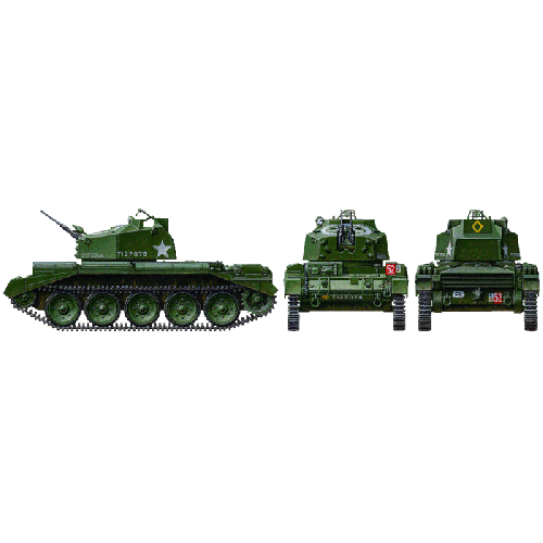 第二次大戦初期にドイツ機の低空攻撃に苦しめられたイギリス軍は、その対抗策として様々な対空車輌の開発を進めました。中でも最も完成度が高いのがクルセーダーMk.III 対空戦車Mk.III です。クルセーダーMk.III の車体に、スイス・エリコン社製の20mm機関砲を2門装備したオープントップ式砲塔を搭載。発射速度は毎分480発、最大射程は2,150mに達する優れた攻撃力を誇りました。約600輌が生産されて1944年6月のノルマンディー上陸作戦に投入されましたが、すでに連合軍が絶対的な制空権を握っており、地上部隊の攻撃支援などに威力を発揮しました。