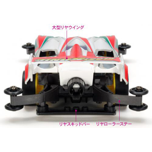 空力の追求はもちろん、整備性や剛性、拡張性などミニ四駆レースに必要な要素をかねそなえているのがARシャーシ。ボディ各部から取り込んだ走行風をスムーズに流して、シャーシ内部の電池やモーターを冷やし、熱によるパワーダウンを防止。ボディとシャーシのエアインテークをリンクさせて、高い冷却効果を生み出します。また、低摩擦樹脂製のプラベアリングを装備して、駆動ロスを少なくするとともに軽量化を実現しているのもポイントです。アンダーパネルとディフューザーはボディを外すことなく簡単に取り外し可能。さらに、リヤスキッドバーを標準装備。スロープセクションなどの坂道コースを通過する時に、低摩擦樹脂製のスキッドバーがコース路面と接触。マシンの姿勢を制御してコースアウトを防止します。イエローカラーの5本スポークホイールにローハイトタイヤを装着。3.5:1の超速ギヤ付き。