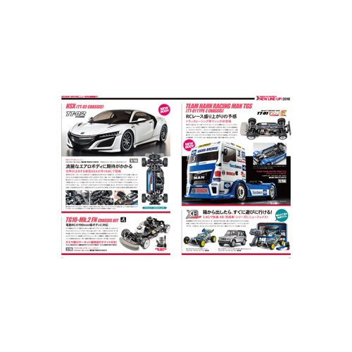 タミヤの主要なRCモデルを厳選して掲載したタミヤRCガイドブックVol.7が発行です。走る場所を選ばないバギー、アクションあふれる走りが楽しいコミカルモデル、ハイスピード走行が魅力のツーリングカーやフォーミュラカー、ビッグサイズが迫力のトレーラートラックやタンク、箱から出してすぐに走りが楽しめる完成モデルのXBなど、タミヤの主要なRCモデルを一挙公開。2016年5月のホビーショーで発表された注目の新製品も掲載しました。好評のQRコードも印刷。スマートフォンや携帯電話を使ってタミヤホームページにジャンプすれば、RCの動画を楽しむこともできます。その他、乾電池で走るコンパクトRCカー「スターユニットシリーズ」を2ページで紹介したほか、RCスタートガイドではダイナミックな走りが楽しめるRCバギーの走行テクニックを詳しく説明。もちろん、性能アップのためのシャーシ別パーツの紹介、レース参加の手引きなど、これからRCを始めるファンの参考になるページも充実。巻末には全国のホビーショップや、タミヤのRCサーキットも案内しました。オールカラーA4判、ボリュームたっぷりの全38ページ。